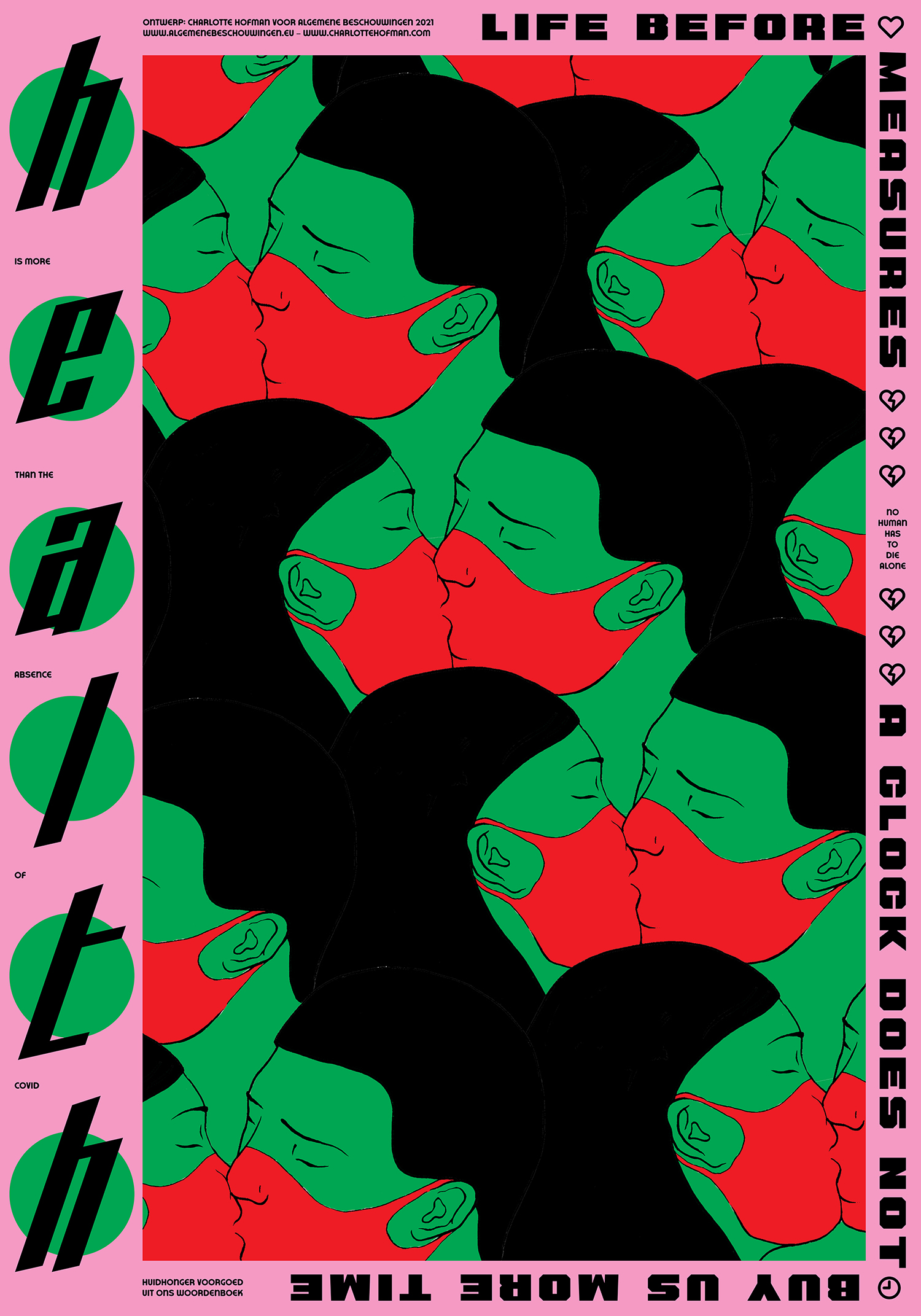 Uit een eindselectie van 10 posters koos de jury unaniem de poster "Health is more than the absence of Covid" van Charlotte Hofman als winnaar van Algemene Beschouwingen 2021.